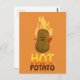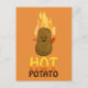 Fun cartoon brown potato with a big happy smile, dots for eyes and sticks for arms. He is surrounded by yellow and orange hot burning flames. Below him in orange and yellow text is the word HOT and below that in brown text is the word POTATO. Fun quirky design for a laugh.