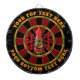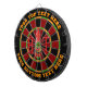 Dark red, black, green and orange dartboard design. Each colour is customisable. HOT letters with the O made with a chily pepper sauce bottle. Two custom text areas on outer ring.