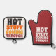 The hilarious Hot Stuff Coming Through Humour oven mitt and pot holder from Ricaso will have you laughing while you cook.