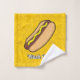 Cartoon illustration of hotdog. Junk food outline icons yellow pattern background. Custom text on each towel.