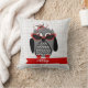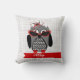 A pillow featuring an illustration of a grey and black owl with a houndstooth belly and red feet. Owl is wearing a red and black fascinator hat and red cat eye sunglasses. Personalise with your name. Opposite side is houndstooth.