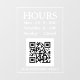 Hours Open Sign with QR code for store entry door or window in white text on transparent background with QR code message.