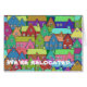 Graphic with a lot of colourful houses and the text "We're relocated"