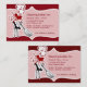 New trendy retro housecleaning business card template designed on larger than standard size business card stock for a maid or housekeeper in a beautiful double side retro design including a retro cleaning lady symbol and text templates to customise online. Designed for a home or office cleaning service that wants to stand out and be unique.
