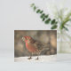 This postcard features a male house finch standing in the snow. He has lovely has red plumage on his head and breast. Snow clings to his beak. The luminous background is in shades of gold, grey, orange and white.