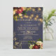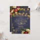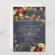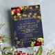 A beautiful rustic traditional winter housewarming party invitation featuring flowers bouquets of dark burgundy, vibrant red and peach ivory cream roses, and peonies, strings of twinkle lights and a chic faux gold calligraphy script over a dark midnight navy blue chalkboard background. ++++++++++++ The invite is suitable also for any other summer night or autumn fall rustic country / outdoor backyard / farmhouse parties, barbecues, celebrations or anniversaries.