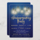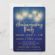 This charming invitation design features an illustration of seven dangling old-fashioned lightbulbs spanning the top edge, each bulb glowing with warm light and highlighted with pale starbursts. The bulbs are the antique Edison-style bulb, which adds a retro spirit to the design. The background colour is a gradient image in shades of bright and navy blues. Below the string of lights are eight lines of customisable text , just personalise by using the easy, provided templates. A typography artwork that reads "Housewarming Party" in golden yellow can be used or if you are hosting a different kind of party, simply delete this art and add your own text using Zazzle's design tool. The reverse side of the invitation is printed with the same striking blue gradient. It has one single hanging lightbulb below which you can add more text with event details, or if you don't need to add anything more, simply delete this text box or leave blank. Perfect for new home housewarmings, evening parties or hipster events!