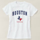 Houston, Texas flag map design women's white T-Shirt. This design features the words "Houston" in blue and "Texas" in red with the map of the state filled with the flag of Texas. Wear this hometown T-Shirt to show you are patriotic and proud to be from Houston or to give it as a gift.