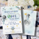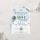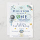 Adorable baby Birthday invitation featuring an astronaut, rocket ships, Earth & stars set on a dark blue background. Flip our cute boys invitation over to view a coordinating shooting star back. Visit our shop for our entire line including matching diaper raffle & book cards.