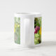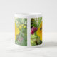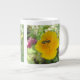 This awesome mug features a detailed photograph of a gorgeous black and yellow striped hoverfly hovering above a yellow Californian Poppy.