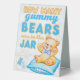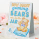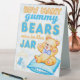 Guess How Many Gummy Bears Baby Shower Game. Cute Blue & Brown Baby Boy Theme with Stuffed Brown Teddy Bear sitting on a blue pillow with blue bowtie. ©2023 Miss Sassy Party Designs™