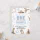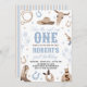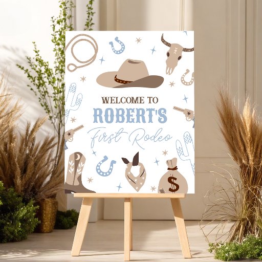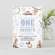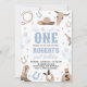 Saddle up for a wild ride! This Western-themed first birthday invitation features rustic desert elements like a cowboy hat, cacti, and horseshoes in soft blue and tan. Perfect for a "How the West Was One" celebration. Easily customize with your son's name and party details for a classic cowboy feel.