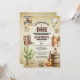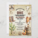 Saddle up and join your guests for a fun Western-style cowboy first birthday party. A weathered parchment background showcases elements of a perfect rodeo birthday party, including a cactus, guitar, wagon wheel, cowboy boots, saddle, tumbleweed, and much more! Western-style ornaments decorate the invitation to create a unique theme for a first birthday or other age birthday parties. Available with matching products.
