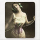 Vintage photograph of a young woman in bloomers and a corset. She is holding the laces of the corset as if she's ready to pull it tighter even though it's incredibly tight already