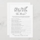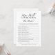 Introducing the "How Well Do You Know The Bride?" game card, a stylish addition to any bridal shower! Featuring a minimalist black and white design, this game card invites guests to test their knowledge about the bride in a fun and engaging way. Perfect for creating memorable moments and laughter, it seamlessly fits into any bridal shower theme. Designed by CaMiDesigns, this game card is a delightful way to celebrate the bride-to-be. For assistance with orders, shipping, product information, and more, please contact Zazzle Customer Care directly.