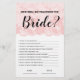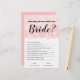 Bride Pink Lace Bridal Game is a charming and playful activity designed to bring laughter and connection to bridal showers and bachelorette celebrations. Soft pink tones paired with delicate lace styling give it a romantic, feminine look that fits beautifully into any bridal theme. The game is easy to understand, making it perfect for guests of all ages to join in without awkward explanations. It encourages fun interaction, lighthearted competition, and memorable moments among friends and family. High-quality materials ensure it looks elegant while still being durable enough for an energetic party. The design feels special and celebratory, making it more than just a game but also a lovely decorative accent. Ideal as a centerpiece activity or thoughtful gift, it adds joy, bonding, and bridal magic to the event.