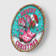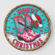 This vibrant, fun clock features a pair of pink and turquoise cowgirl boots decorated with stars and a cow print. Set against a snow-covered ground and a sparkling turquoise background, the design includes a Santa hat and festive greenery. The clock face is encircled by a braided rope border embellished with pink and turquoise jewels, declaring "HOWDY CHRISTMAS" in bold, glittery letters.