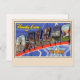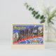 This vintage postcard reproduction features large letters filled with iconic images of Dallas Texas