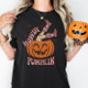 This design features a cowgirl with pink boots and a pumpkin with the funny halloween phrase: Howdy Pumpkin. Perfect for your Halloween wardrobe!