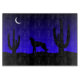 Embrace the spirit of the wilderness with this atmospheric southwestern design. Featuring a lone wolf silhouetted against a deep blue starry sky, this scene captures a peaceful desert night framed by saguaro cacti and a glowing crescent moon. Its bold, graphic style and calm colour palette make it a versatile choice for home decor, apparel, or stationery for nature lovers and fans of the American West.