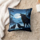A pack of wolves serenades the night, silhouetted against a luminous full moon, framed by tall pines and distant mountains.