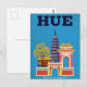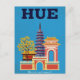 Celebrate the imperial history of Hue, Vietnam, with this graphic vintage travel poster style postcard. The design features a composition of iconic structures, including a tall, tiered pagoda (like Thien Mu) and brightly colored imperial gates and walls, all set against a vibrant blue sky. The bold, graphic lines and contrasting colors create a striking retro look that emphasizes the city's subtitle: "Historic and tranquil." Perfect for history enthusiasts, collectors of Vietnamese art, or anyone sending a unique greeting from this former imperial capital.