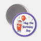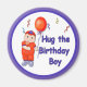 This fun design features an adorable little boy in vibrant red holding a balloon. Multi coloured streamers in the background and text that says...Hug the Birthday Boy. Perfect for celebrating his special day.