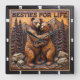 This highly dimensional square wall clock features an illustration of two reddish-brown bears hugging in a rugged, rocky setting. The entire design is rendered in rich brown, orange, and tan tones, strongly suggesting a deep carved relief or Engraved Wood Look. The bears have highly textured fur and are positioned among large, light gray-brown boulders. The background includes dark, stylized pine trees and layered, angular mountain peaks under an orange sky. The carving style creates a strong three-dimensional effect, emphasizing the rugged terrain. The large, three-dimensional embossed text "BESTIES FOR LIFE" is carved across the top. The clock face features a simple clock face border with large, white, numbered tick marks (1 to 12) integrated into the outer frame. The artwork is surrounded by a thick, dark brown decorative border that resembles a black wood frame.