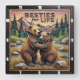 This appealing square wall clock features a highly dimensional illustration of two golden-brown bears hugging beside a stream or river. The artwork is rendered in warm brown, green, and pale orange tones, strongly suggesting a deep carved relief or Engraved Wood Look. The bears have highly textured fur and are positioned on a bank of grass and rocks. The background includes dense, stylized pine trees and layered mountains, indicating a woodland valley setting. The carving style gives the entire image a strong three-dimensional, sculpted quality. The large, three-dimensional embossed text "BESTIES for LIFE" is carved across the top. The clock face features a simple clock face border with large, white, numbered tick marks (1 to 12) integrated into the outer frame. The artwork is surrounded by a thick, dark brown decorative border that resembles a black wood frame.