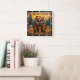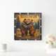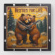 This colorful square wall clock features a dimensional illustration of two brown bears hugging in a mountainous forest setting. The artwork is rendered in vibrant brown, green, and orange tones, strongly suggesting a deep carved relief or Engraved Wood Look. The bears have highly textured fur and are positioned against an orange and yellow sunset sky. The background includes stylized pine trees and layered mountains, while the foreground features large boulders and textured grass. The large, three-dimensional embossed text "BESTIES FOR LIFE" is carved across the top. The clock face features a simple clock face border with large, white, numbered tick marks (1 to 12) integrated into the outer frame. The artwork is surrounded by a thick, dark brown decorative border that resembles a black wood frame.
