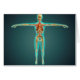 Human body showing skeletal system, arteries, veins, and nervous system.