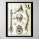 Vintage illustrations of the human spinal column, 3 views of the skull, spinal vertebrae.