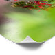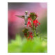 A beautiful image of a sweet humming bird peeking around a red cardinal flower against a colourful background.