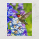 A brilliant male ruby throated hummingbird photographes in a summer garden with a larkspur blossum.