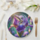 A vibrant hummingbird bathing in a blooming purple iris surrounded by droplets of water that shimmer in the sunlight