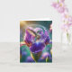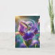 A vibrant hummingbird bathing in a blooming purple iris surrounded by droplets of water that shimmer in the sunlight for blank note card.
