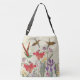 Gorgeous collage of vintage botanical fine art of exotic Hummingbird Birds, and Lilies and Iris Flowers, over faux Rice Paper, is on this Shoulder Bag/Tote. Image is public domain due to expired copyright. Collage is by me.