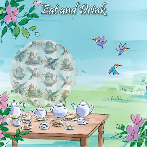 Tea party birthday theme with teapots, teacups and hummingbirds on a green and white striped background.