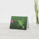 Beautiful hummingbird wth irridescent body is hovering at a pink flower. Vector design on blank notecard for bird lovers.
