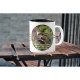 Hummingbird Coffee Cup with fun facts about Ruby-Throated Hummingbirds and a photo of a Female Ruby-Throated Hummingbird taken by Audrey Wenzler of Audrey's Creations.