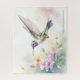 A colorful Hummingbird, flying free among the flowers. Style Pencils and watercolor.