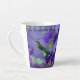 Hummingbird perched on purple flowery stem, with crystal and lace background,