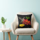 This lovely throw pillow features a female ruby-throated hummingbird. She hovers in the air while drinking nectar from the golden centre of a bright red zinnia flower. A yellow zinnia blossom is nearby and a few green leaves complete the composition. The colours seem to glow against the black background. The image is repeated on the back.