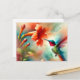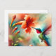 Notecard with abstract watercolor painting of a red-breasted hummingbird approaching a vibrant trumpet vine flower. The dynamic brushstrokes and rich colours capture the beauty and energy of the scene.