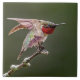 A male ruby throated hummingbird stretches as it sits on its perch.