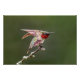 A male ruby throated hummingbird stretches as it sits on its perch.