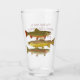 Humourous saying- 'The best way to shrink a fish is with a ruler- the best way to grow a fish is with a beer.' and on other side of glass are the 3 most common trout species- brown, brook and rainbow. From original watercolors by Thom Glace
