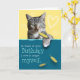 This humourous birthday card features plenty of "catitude". Silhouette photo of a tiger cat with a smug look as a yellow feather hangs from its mouth and others falling down along a teal patterned wall. Fun white and blue fonts for the outside sentiment.