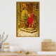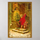 Vintage Hungarian Christmas card turned into a wall art. .A little girl in red coat is holding a tree and ringing the door bell . Though she does not look poor -she is barefoot .Kellemes unnepeket text -means happy holidays in Hungarian .You can read some handwritten message as well .