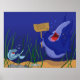 This shark has teeth that were worn down from trying to attack boats, and now he must beg for his food. Since he can't spell, he carries a sign with a crude drawing of a fish and an arrow pointing towards his giant, gaping, nearly toothless maw. A nearby fish is pointing and laughing at this sad shark. Pity this shark, and buy this cool shark cartoon poster for the aquatic animal lovers in your life. The hungry blue shark thanks you.